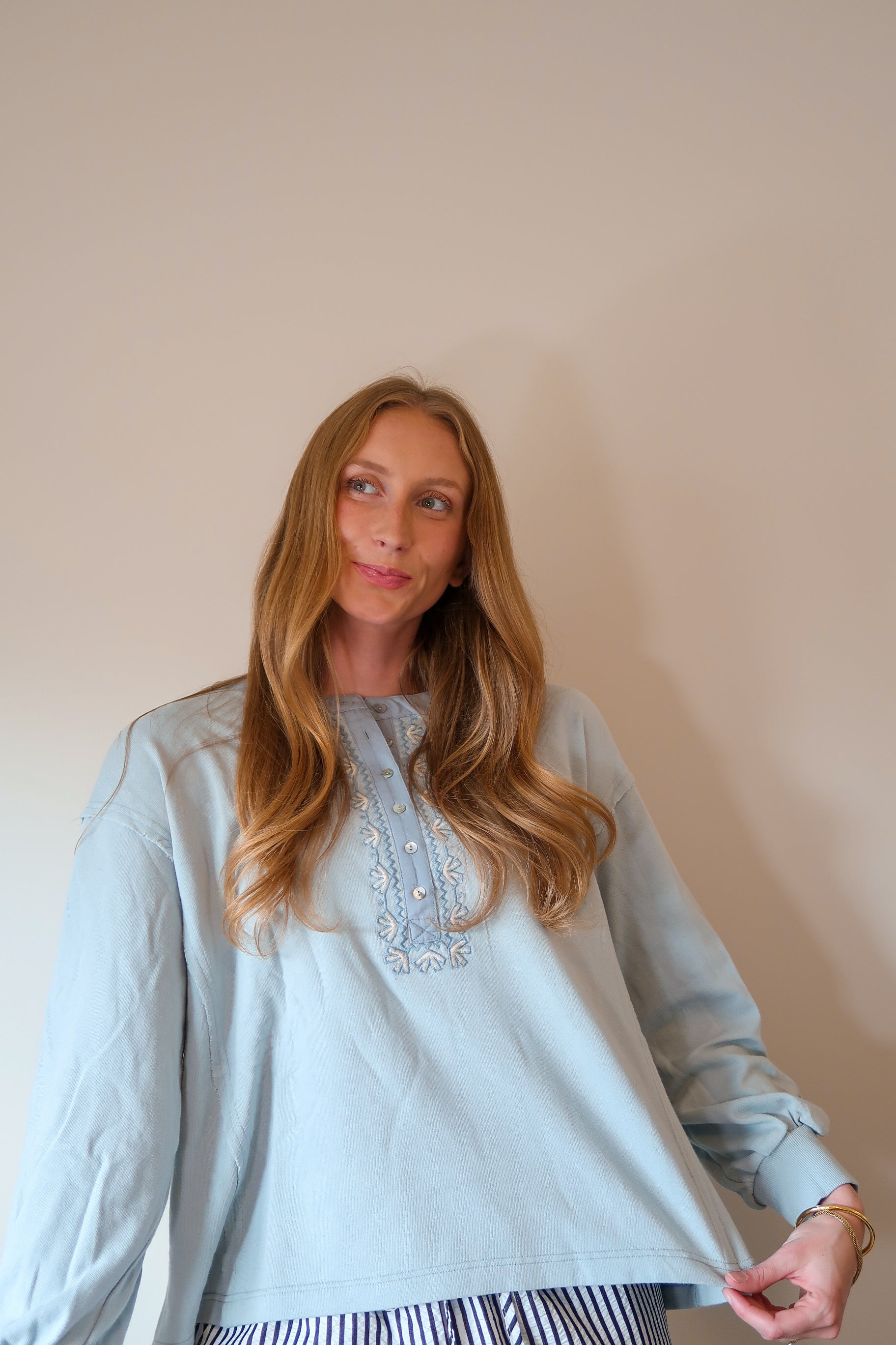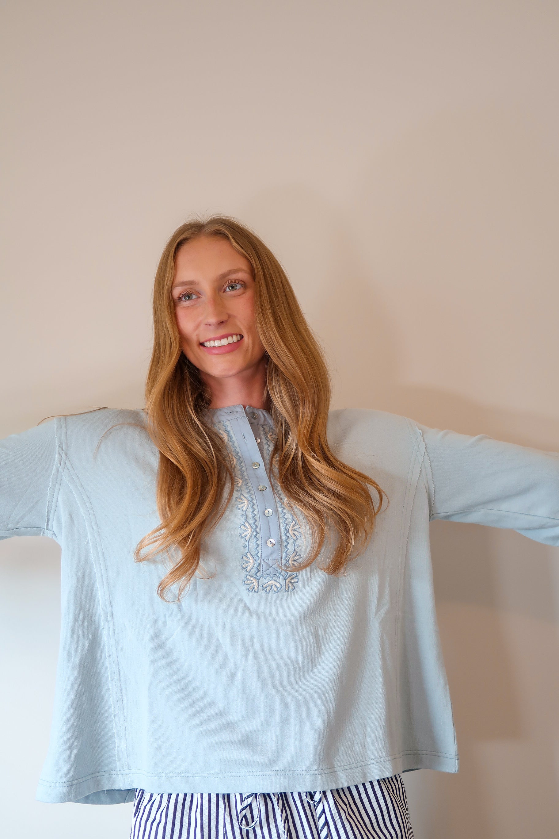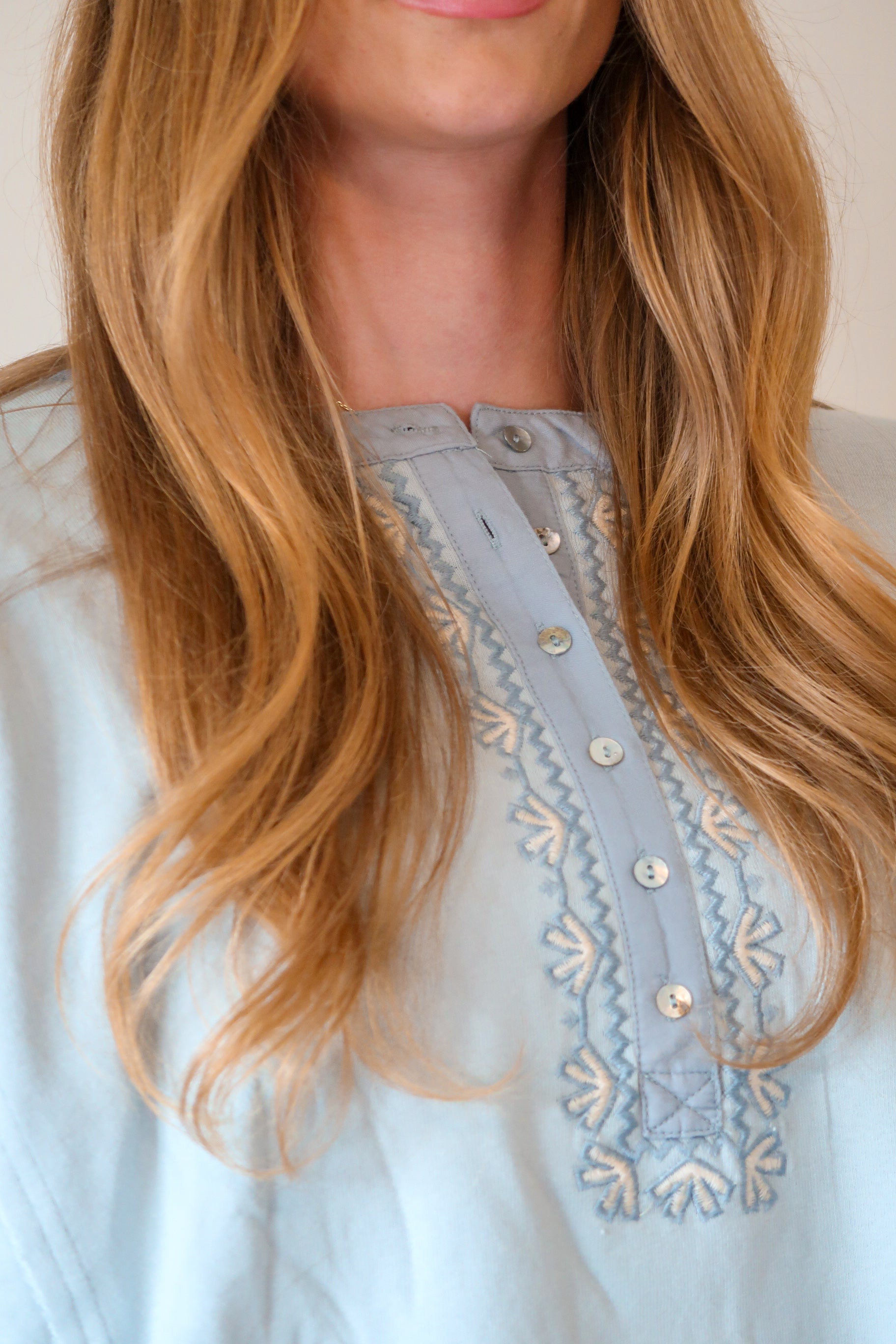 SOFT HENLEY PULLOVER FEATURES: - FRENCH TERRY FABRICATION- GARMENT WASHED FOR THAT VINTAGE FEEL - EMBROIDERED MOTIF ACCENTS AROUND PLACKET - DOUBLE RAW EDGE SEAMS - CUFFED RIB BANDING AT SLEEVES
