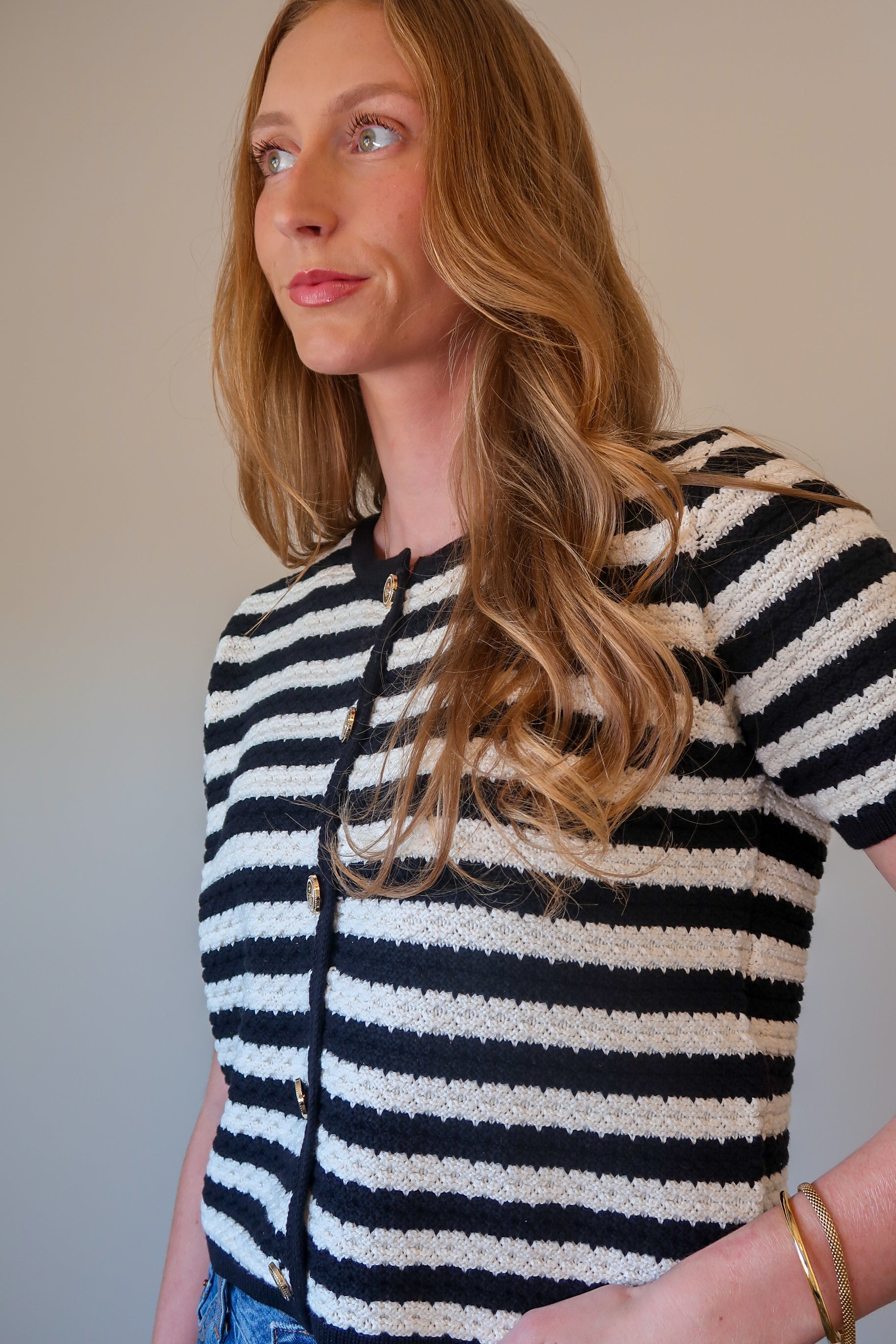 This textured knitted cardigan features stripes and a gold baroque button closure, complemented by short sleeves and a slightly cropped fit..